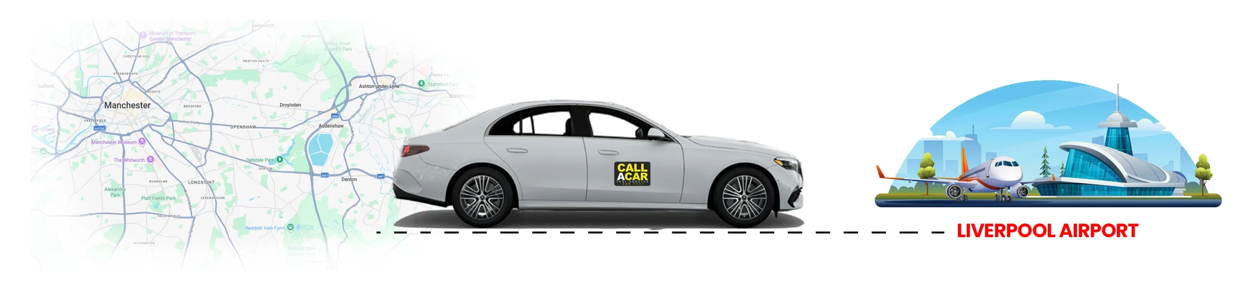Looking for a reliable and affordable taxi from Manchester to Liverpool Airport? At Call a Car, we’ve been serving travellers across Manchester since 1970, completing thousands of safe and reliable journeys every year. Our DBS-checked drivers know the local routes well, helping you reach Liverpool Airport quickly and comfortably. With set fares and no hidden fees, you can relax knowing your airport transfer is in safe hands.